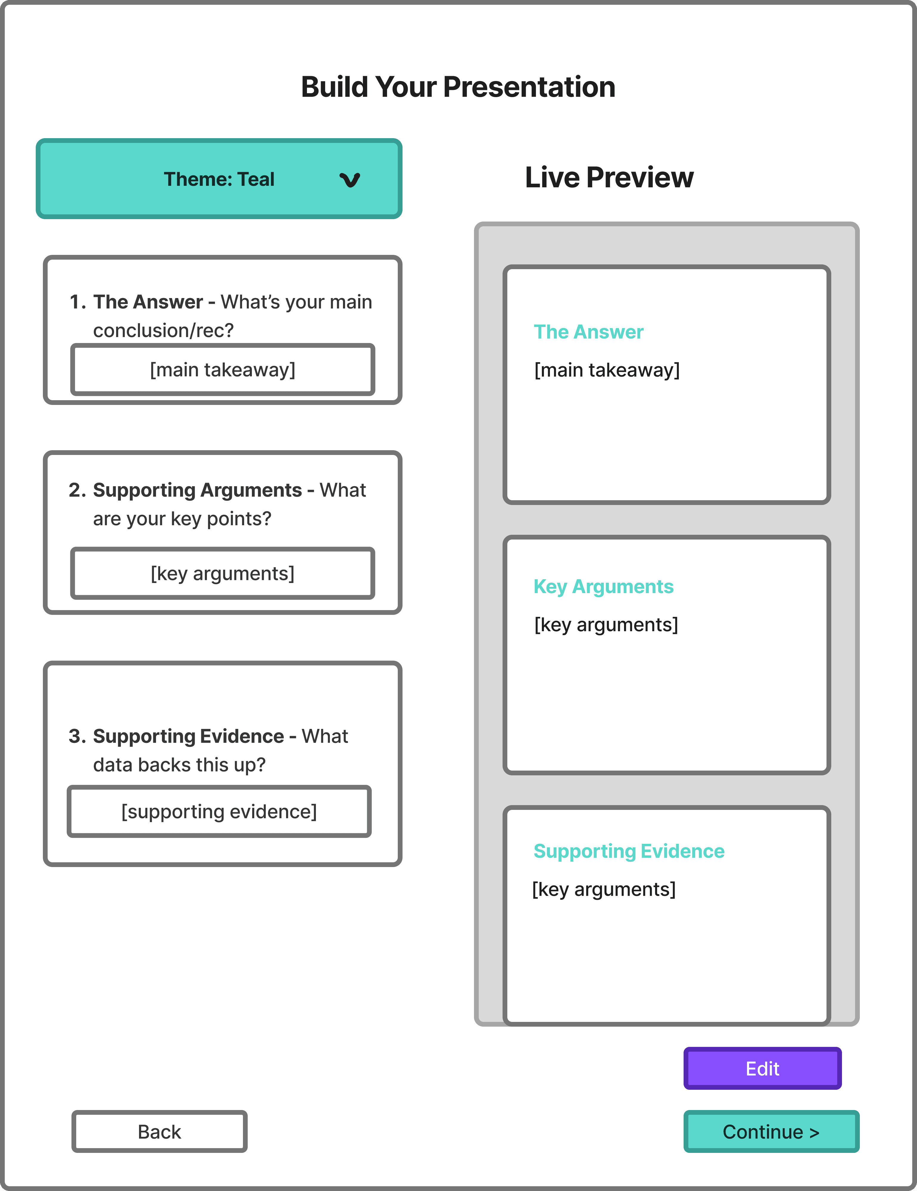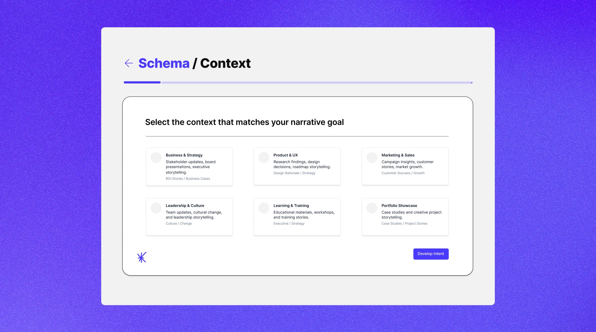 Users begin by selecting the context that best fits their narrative goal, giving them control over how their story is framed. Whether they're working on a business case, design work, or research, this choice influences AI logic and structure to craft a compatible end-product.