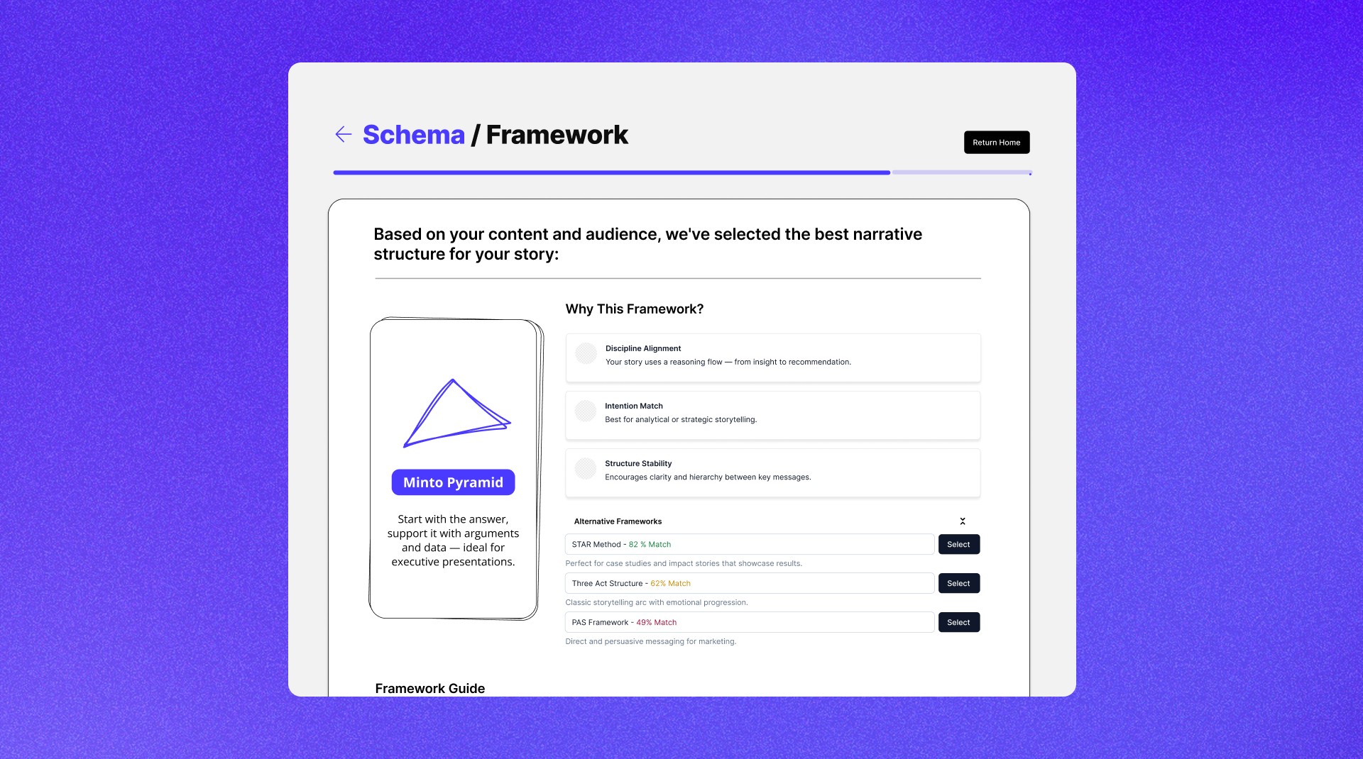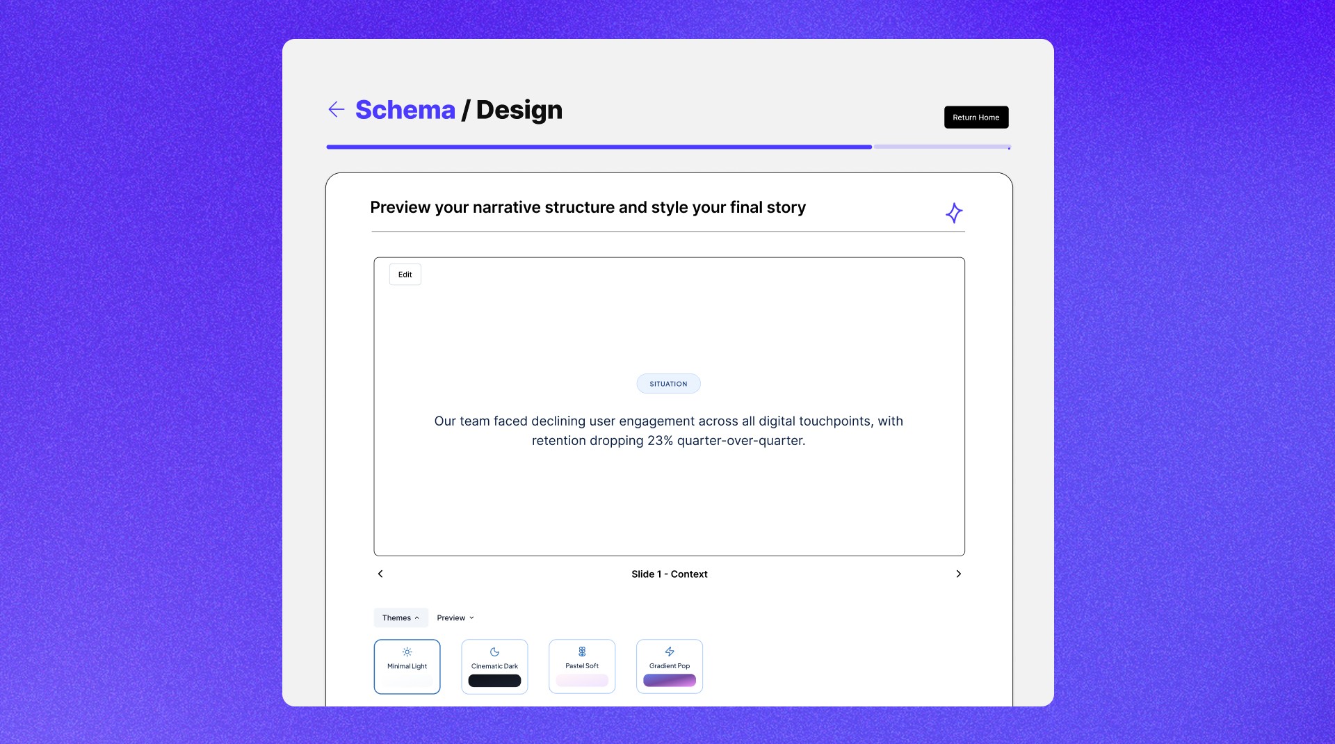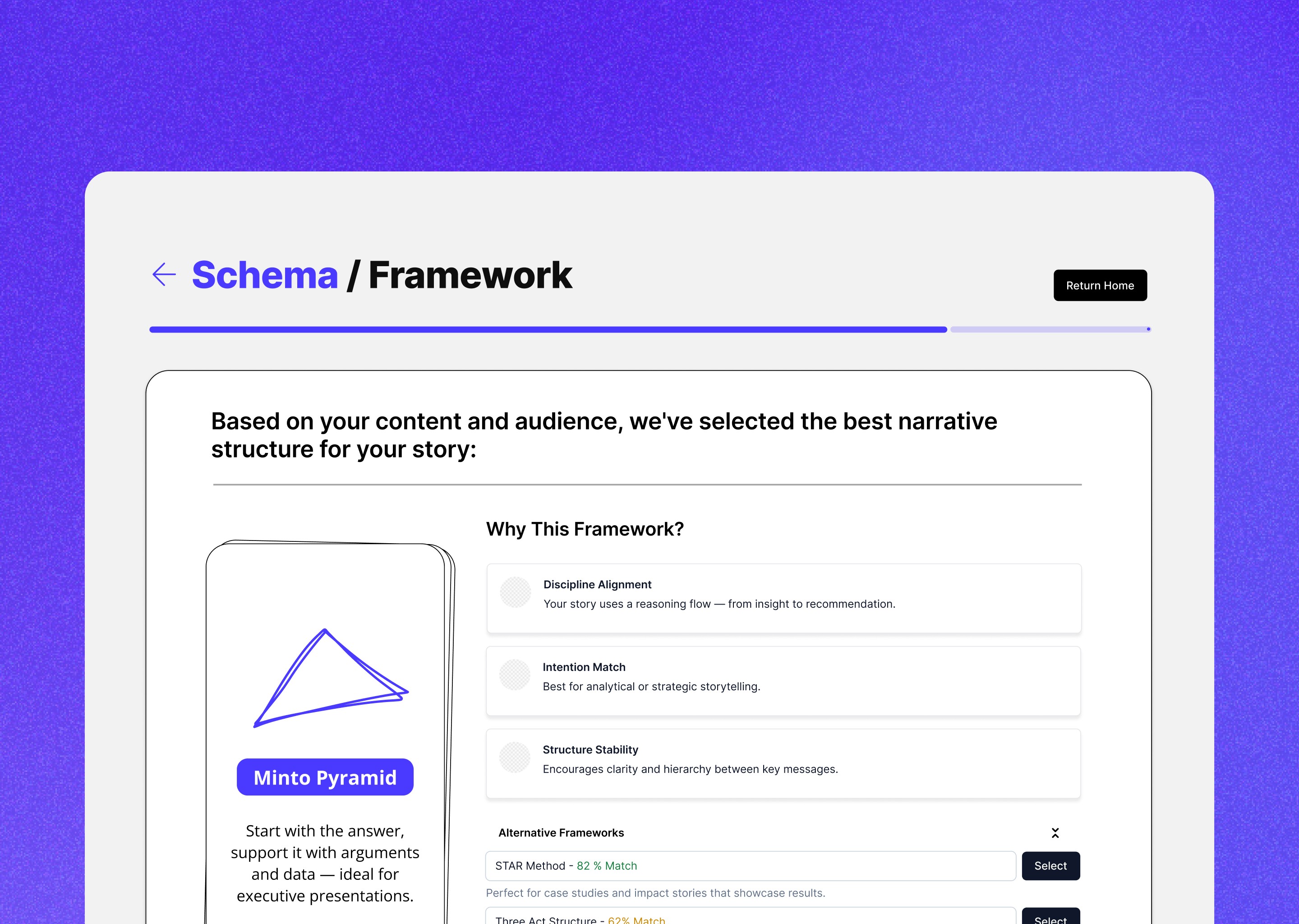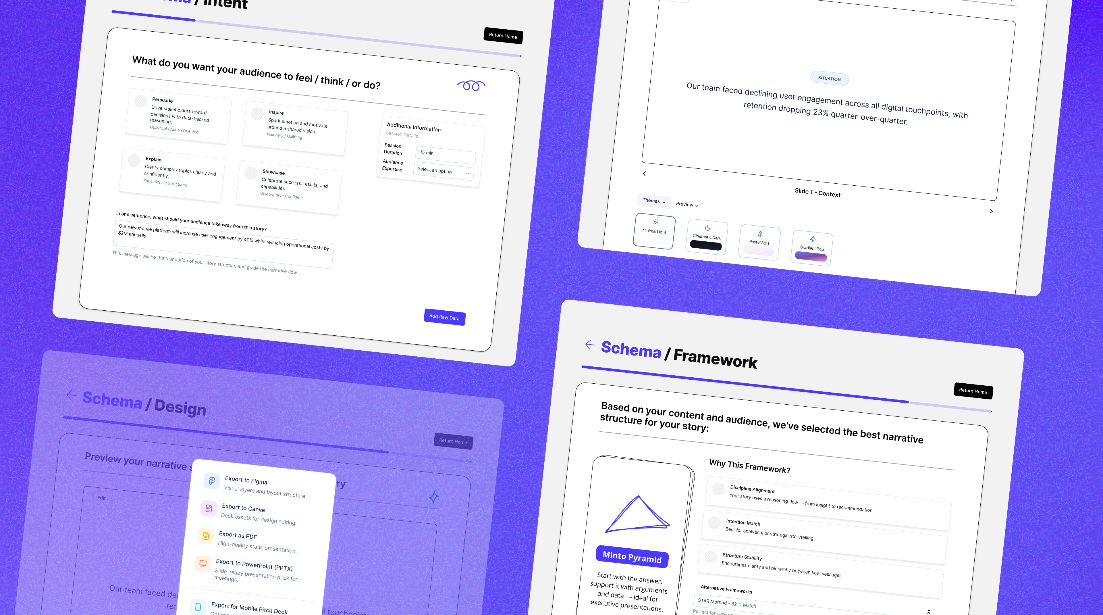 The next phase of Schema is about learning through use. Testing with real users will help validate whether the frameworks, flows, and visual language support how people actually tell stories. As the product evolves, there's room to refine the design system, and explore more frameworks.