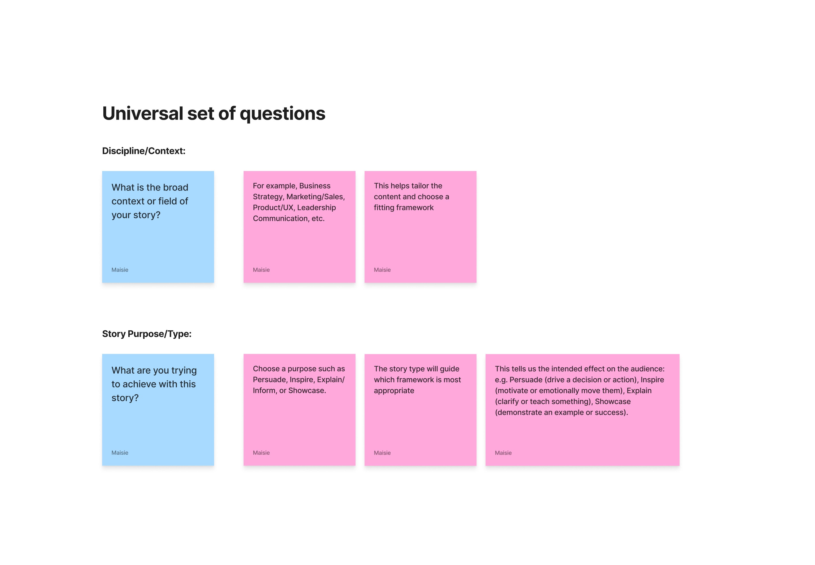 Rather than positioning storytelling as abstract, I leaned into framework-as-object metaphors; distinct cards, icons, and simple visual cues.