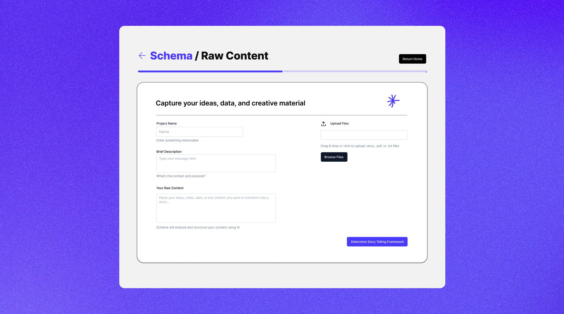 This stage allows users to input raw content without needing to worry about structure. By capturing ideas as-is, the system can analyze them into a coherent narrative. It reduces friction at the start of the storytelling process.