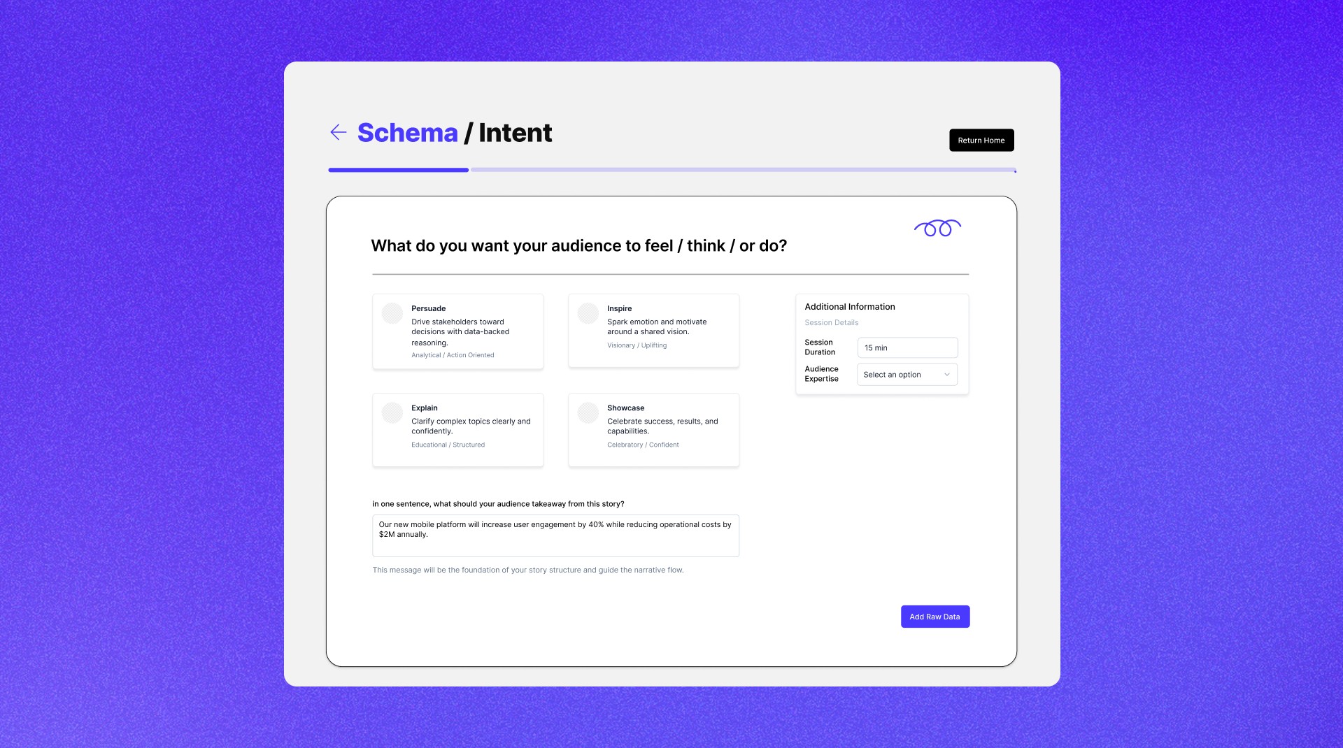 This step helps users clarify what they want their audience to feel, think, or do. By choosing an intent, like persuade, or inspire, users shape the tone and depth of the story.
